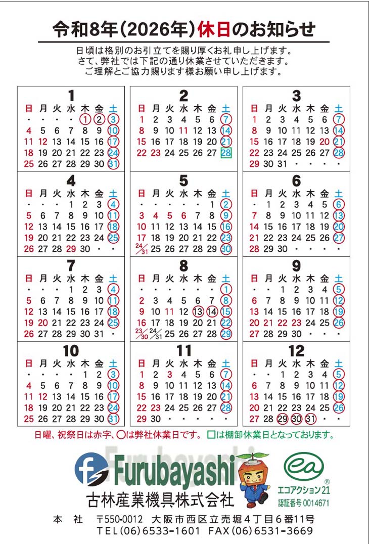 2026年営業日カレンダー 2025.12.26 平素より格別のご愛顧を賜り、誠にありがとうございます。 当社2026年の営業日につきまして、上記カレンダーの通りご案内申し上げます。 ご確認のほど、よろしくお願い申し上げます。 エコアクション21の認証・登録事業者になりました